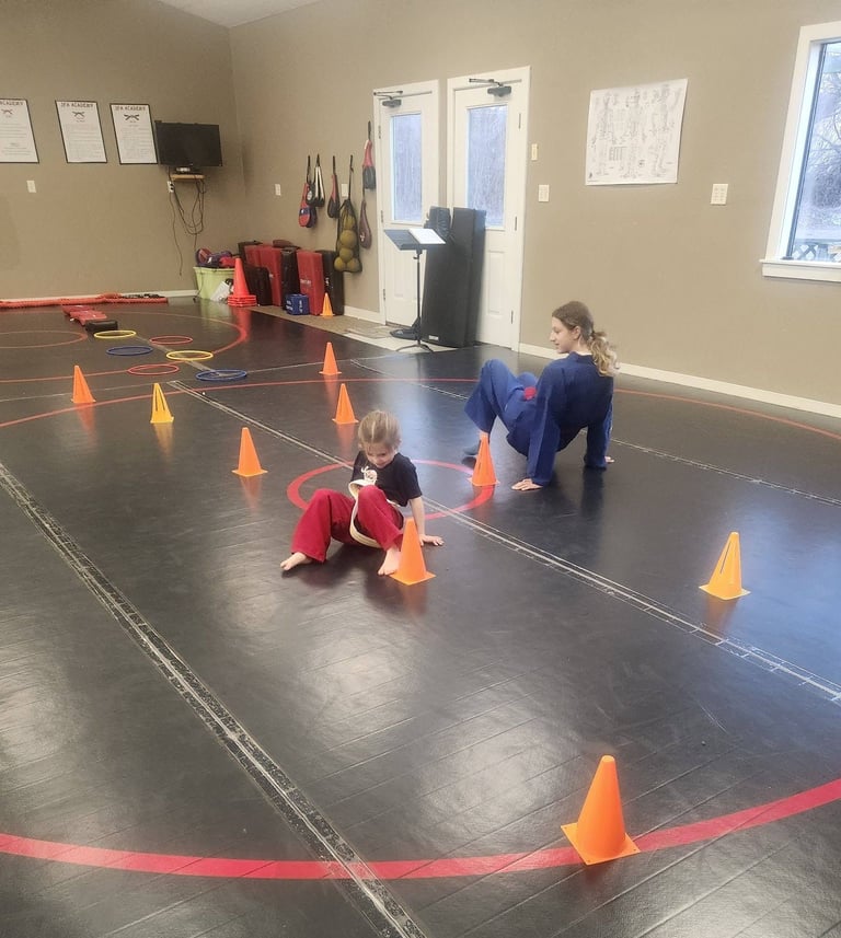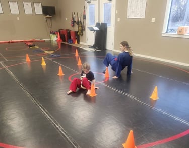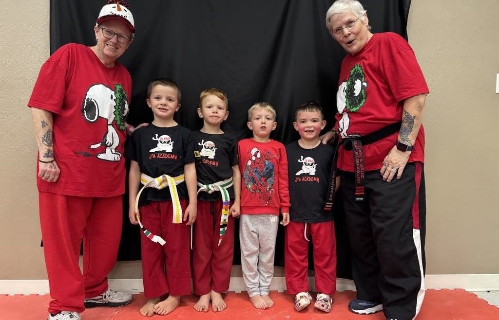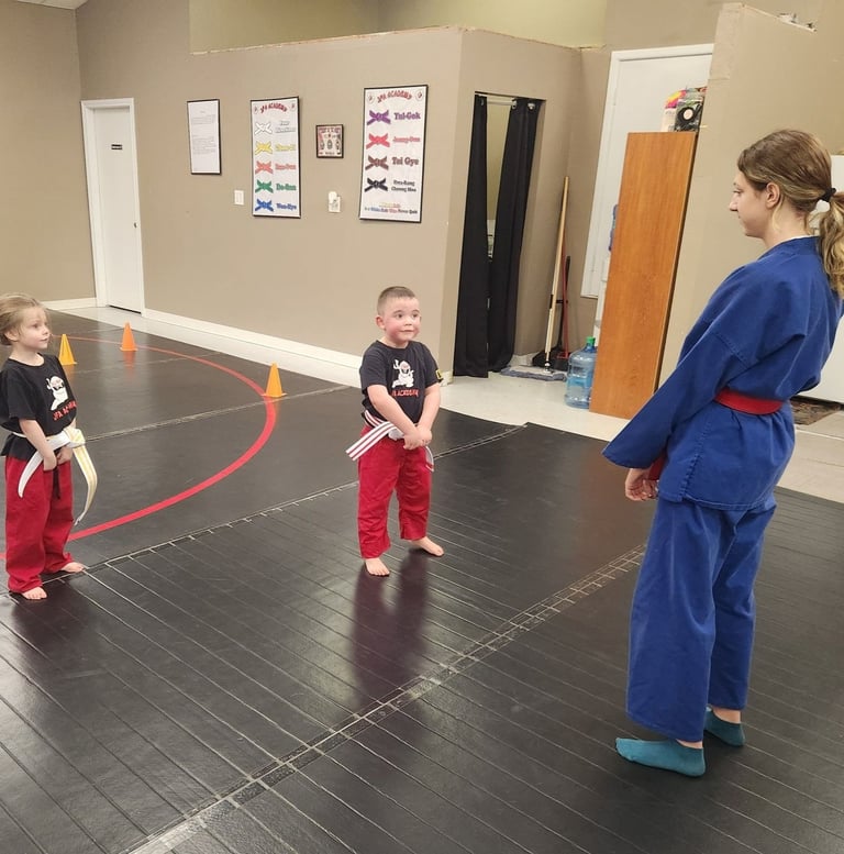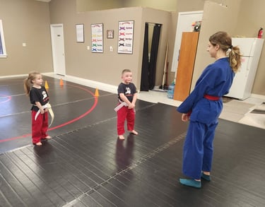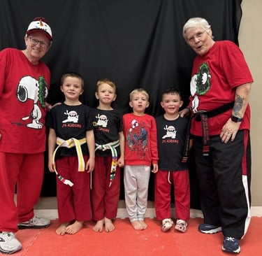 The Tiny Tots program is a fun, age-based curriculum that focuses on improving preschool-age children's basic motor and listening skills. Three to four-year-old's love physical activity and anything involving play. Sensei Elaine is a wonderful youth teacher and she is a Survivor of the 2024 Sulphur Tornado. With the help of our Leadership and her best friend Barbara, they all make a great time for our Tiny Tots program. Elaine also teaches sign language to her class due to her and Barbara are deaf.